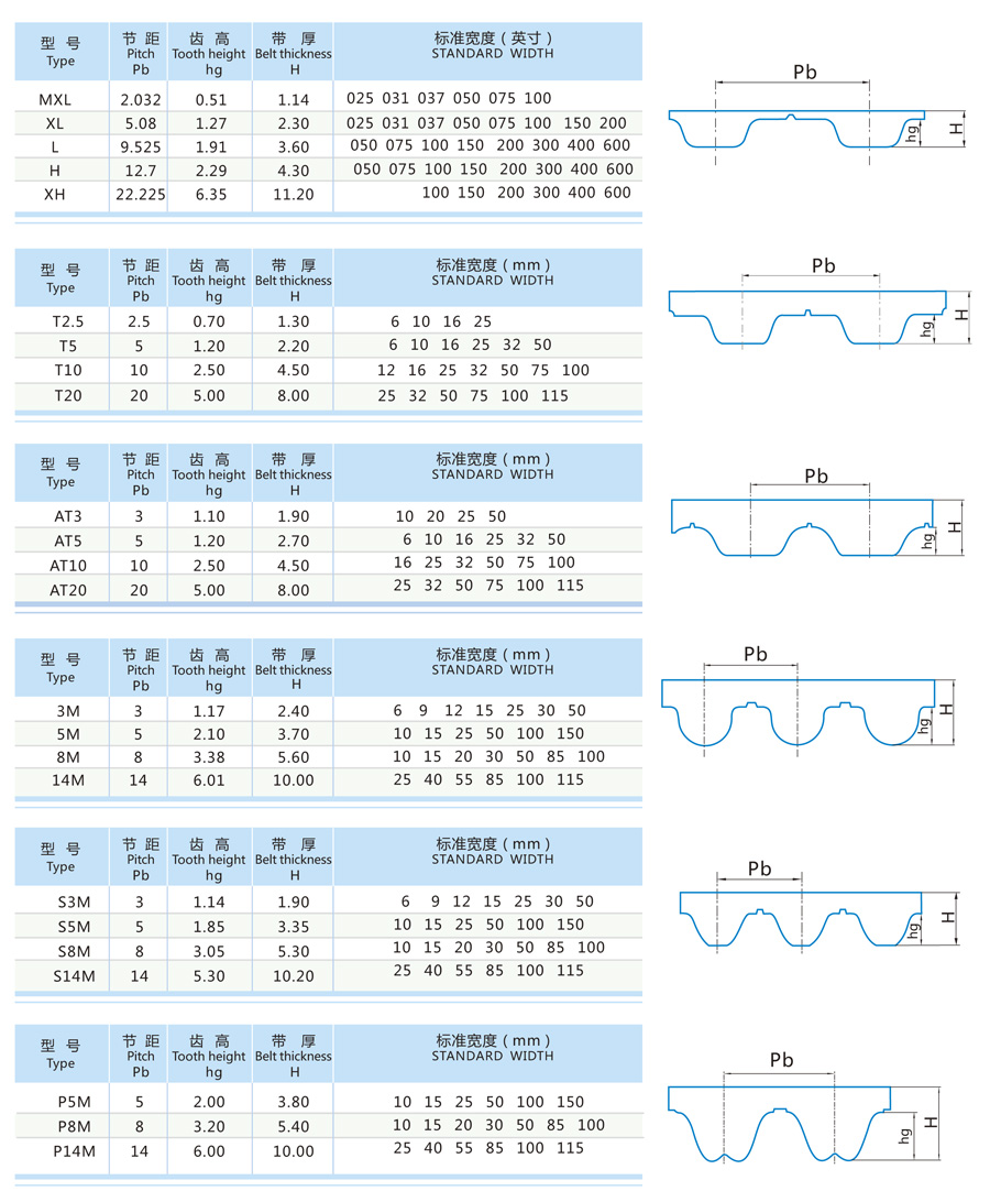 根據客戶需求,可定制MXL、XL、L、H、XH、T2.5、T5、T10、T20、AT3、AT5、AT10、AT20、3M、5M、8M、14M、S3M、S5M、S8M、S14M、P5M、P8M、P14M等型號的PU同步帶。